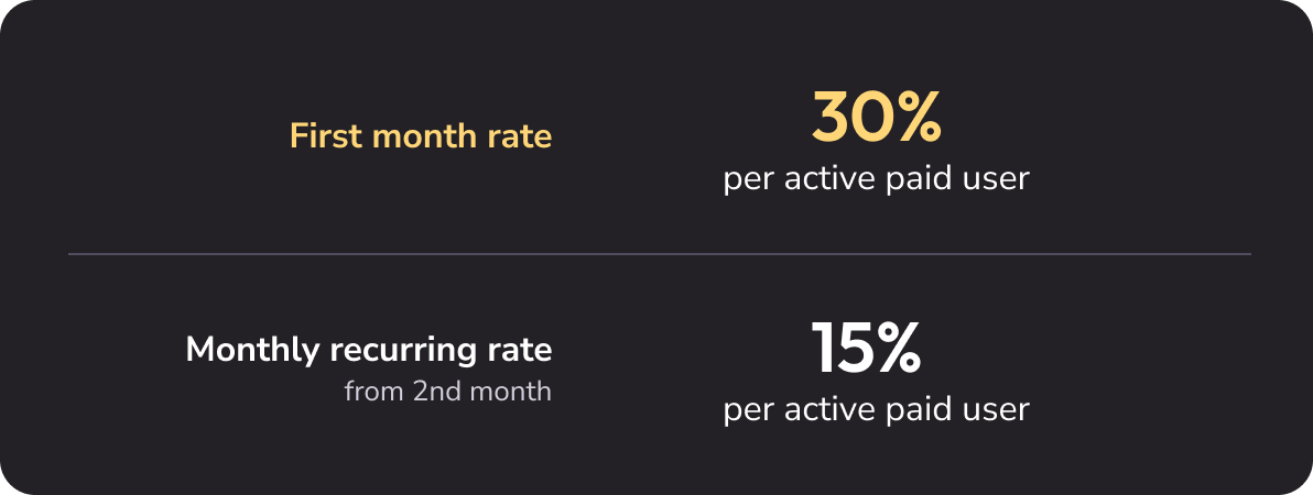Up to 60% revenue share for the 1st month and 30% for the following months of user’s lifetime from net subscription fee.