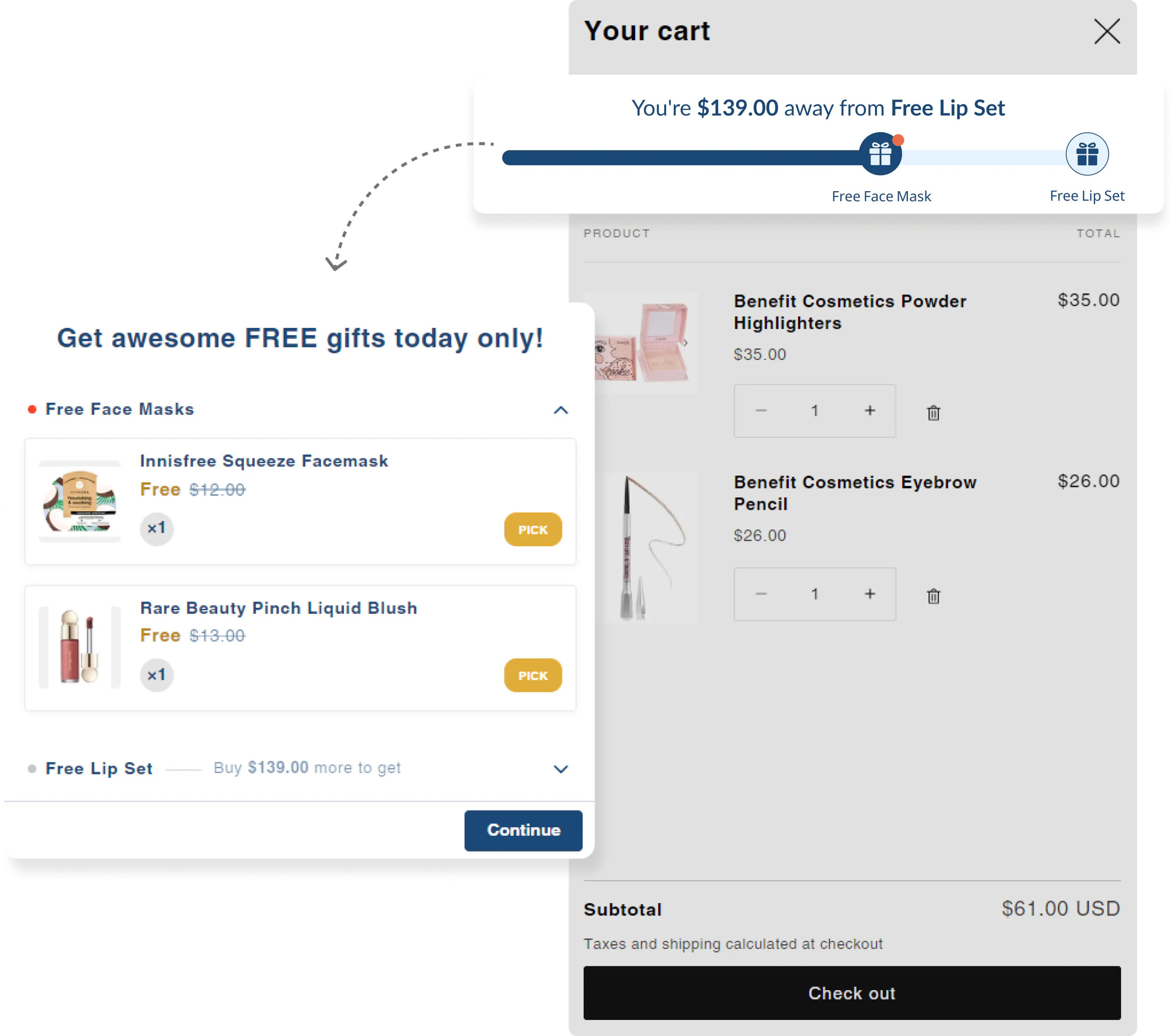 Increase the conversion rate for cart upsell discounts by displaying a progress bar, showing customers how much more they need to spend to unlock the discounts.