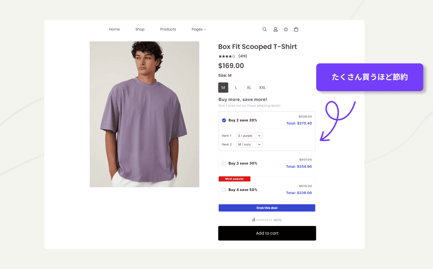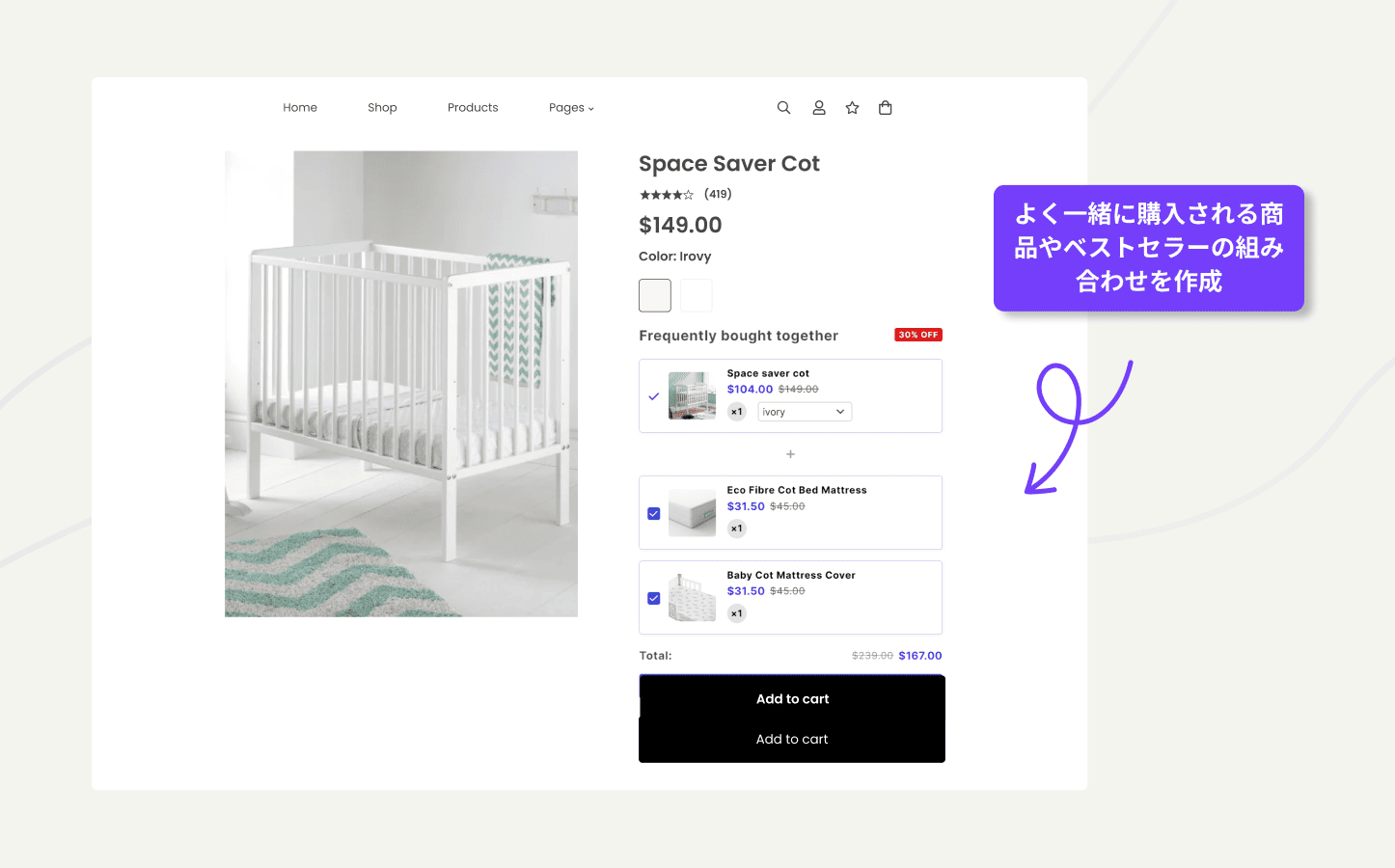 商品セットを活用して、1回の購入でより多くの商品を売ることで平均注文額(AOV)を増加させます。